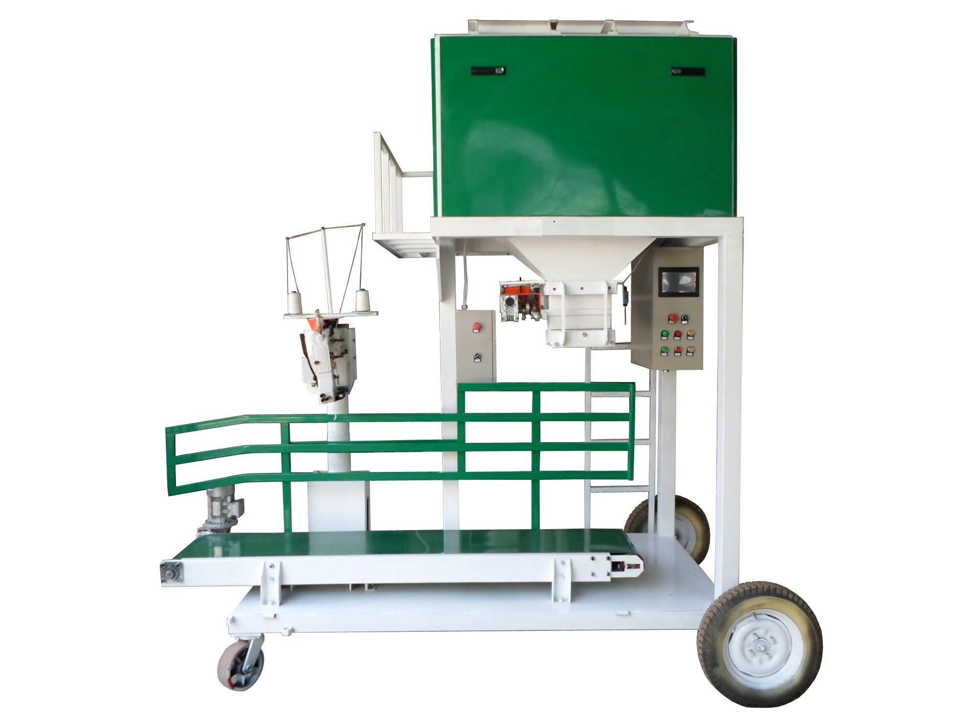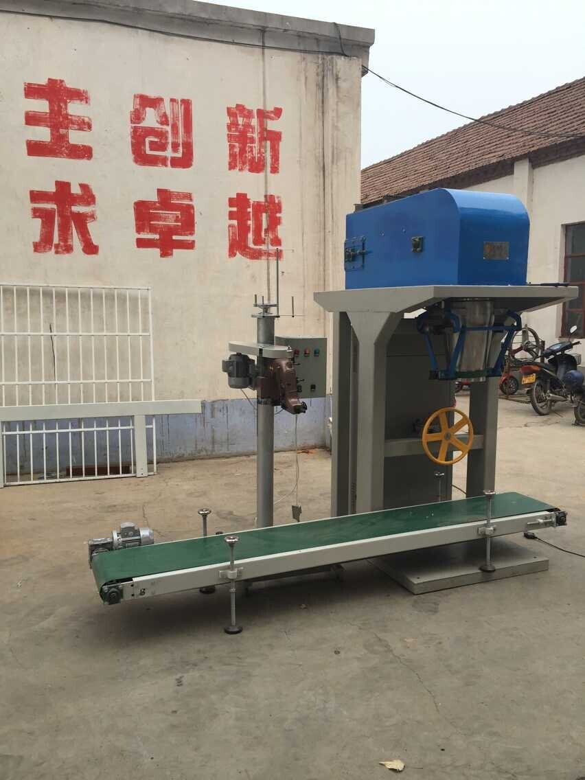 3、電腦定量包裝秤定量范圍寬,精度高,配合臺面可升降的輸送縫包機,一機多用,效率高。